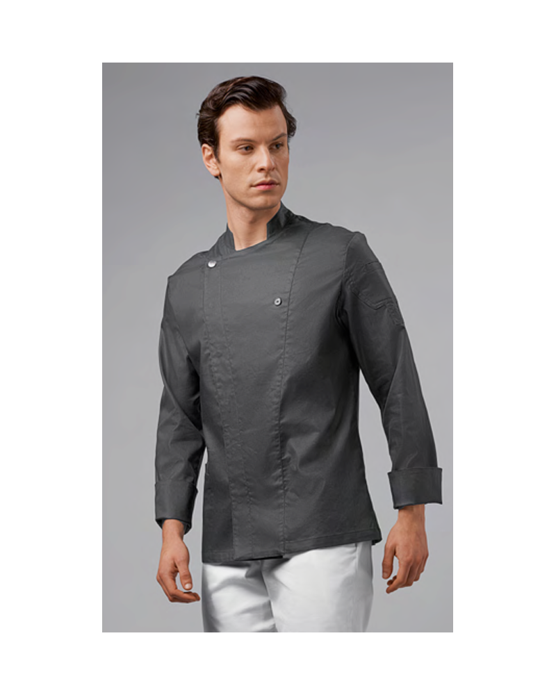 Veste de cuisine homme à col mao, réalisée en twill de coton et Lycra® T400®, avec d'excellentes propriétés élastiques et respirantes. Fermeture à double boutonnage avec boutons-pression, pan pouvant être rabattu sur la poitrine et fixé à un bouton apparent, ce qui crée l'effet d'un revers ajusté et d'un col en V innovant. Manches longues avec poignets retroussables, lunette en tissu mesh sous l'emmanchure, pour faciliter la respirabilité. Complété par une petite poche porte-stylos. Poche porte-smartphone pratique à la taille. Fentes verticales dans le bas du dos pour faciliter les mouvements.