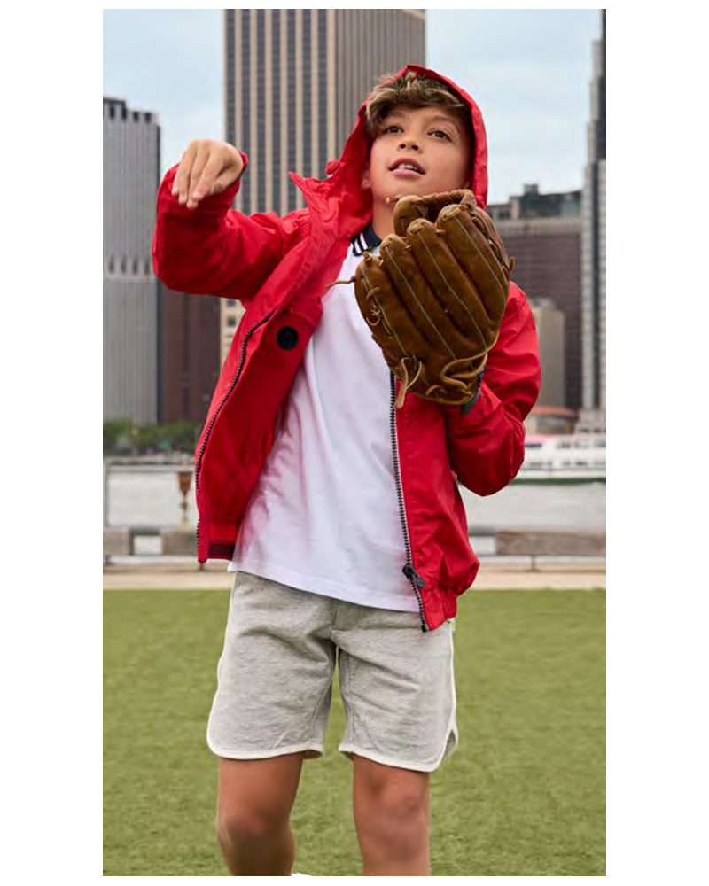 Bermuda enfant en sweat avec élastique et cordon coulissé à la taille, zip avec patte, deux poches sur le devant et liseré de finition en contraste.