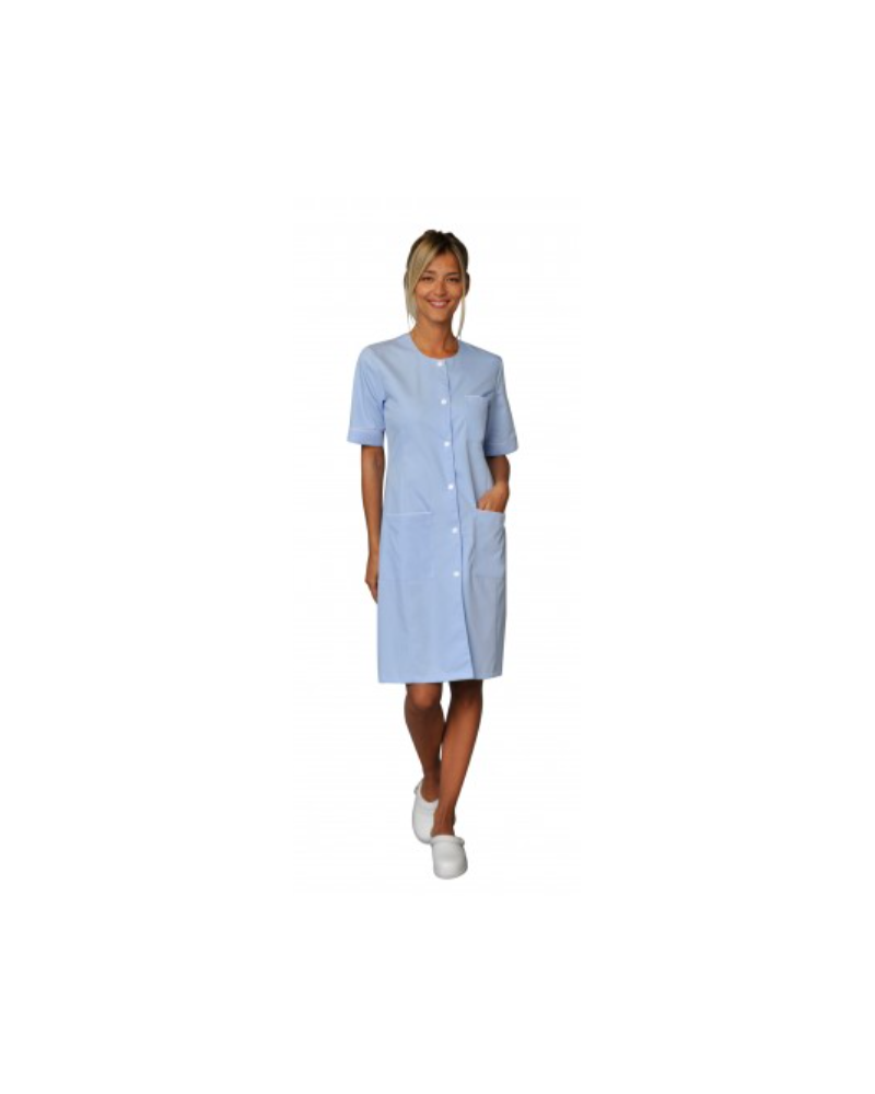 Blouse de travail longue pour femme avec une encolure arrondie, fermeture pression et poches.