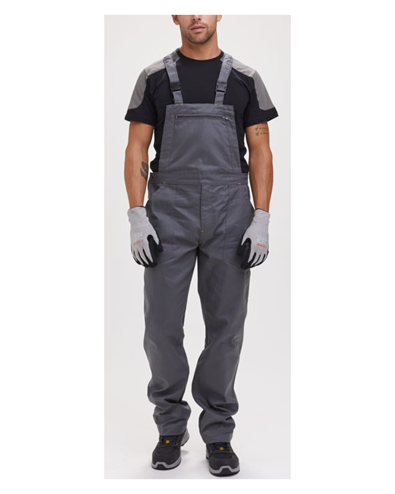 Salopette de travail en 100% coton avec grande protection des reins, bretelles élastifiées et boucles à fermeture automatique, ouverture latérale avec boutons, fermeture du rabat avec fermeture éclair, élastique à la taille. Couture entrejambe et intérieur jambe à double aiguille. Poche de poitrine avec porte- badge et fermeture éclair, deux poches frontales et poche porte- stylo, poche porte- mètre latérale droite et une poche arrière avec rabat de fermeture à velcro.