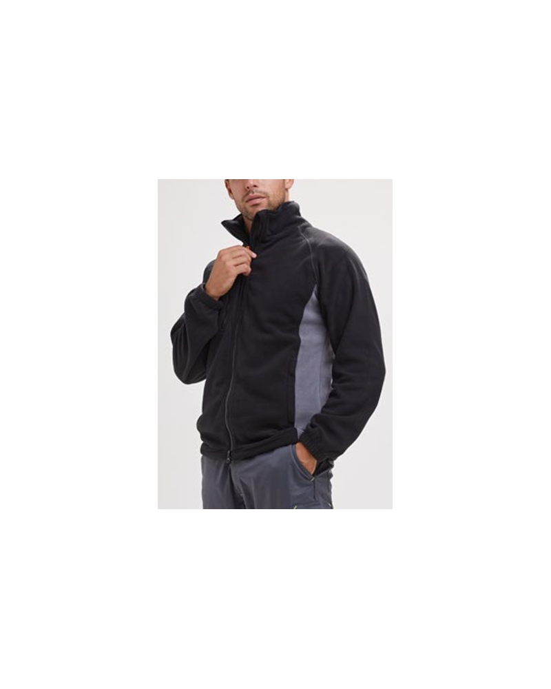 Veste polaire bicolore pour homme (existe aussi en modèle femme) à zip intégral de 8 mm en plastique noir, manches raglan, coulisse réglable à la taille, élastiques serre-poignet, deux poches avec zips couverts, une poche avec zip sur le devant, col avec bordure de renfort en contraste, coutures renforcées.
