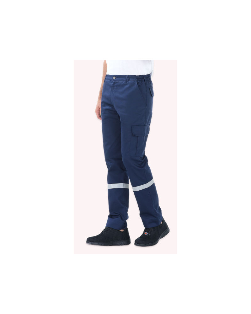 Pantalon ambulancier, ceinture élastique côtés avec 7 passants, braguette ZIP, 2 poches italiennes, 2 poches cuisses à rabat fermées par velcro, 1 poche stylo sur cuisse droite, 2 poches arrière fermées par velcro, bandes rétro-réfléchissantes de 30 mm, longueur d'entrejambe 78 cm modifiable à 84 cm avec double ourlet