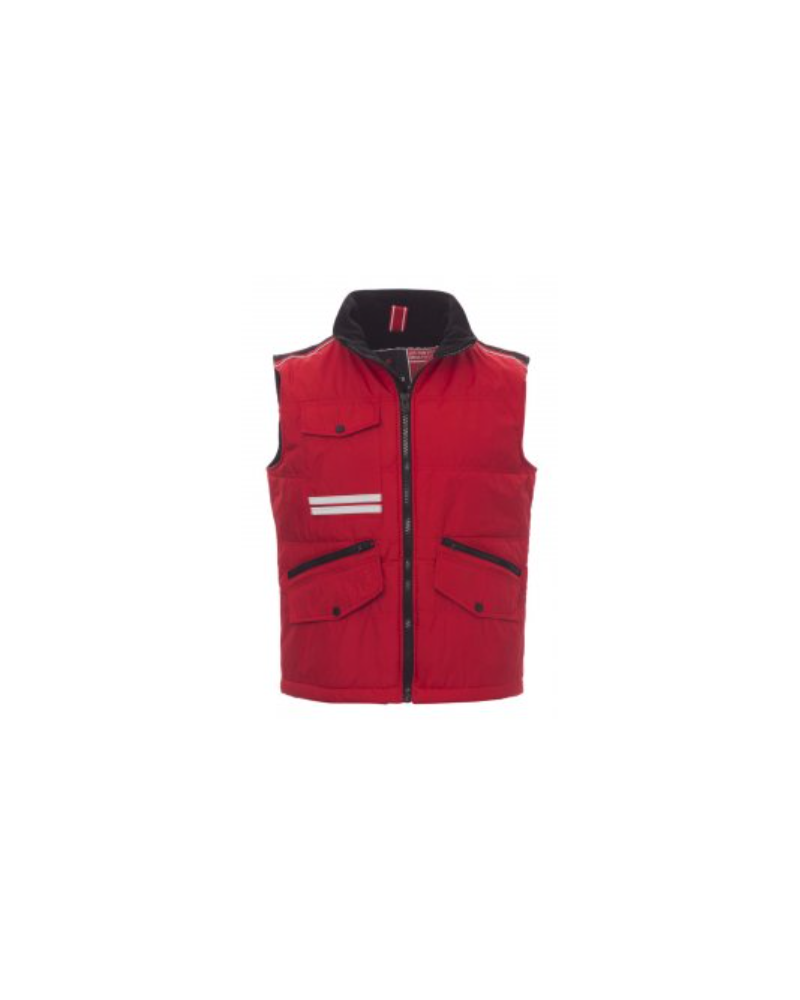Gilet unisexe, à zip de 8 mm en plastique avec curseur en métal, à rabat et boutons en plastique, arrière profilé, deux poches extérieures et deux poches à fermeture éclair, poches obliques pour faciliter l'introduction des mains, une poche de poitrine pour smartphone et anneau porte-badge, passepoils réfléchissants sur poche de poitrine et au dos. Intérieur : rembourré, polaire en contraste au dos et sur le col, une poche